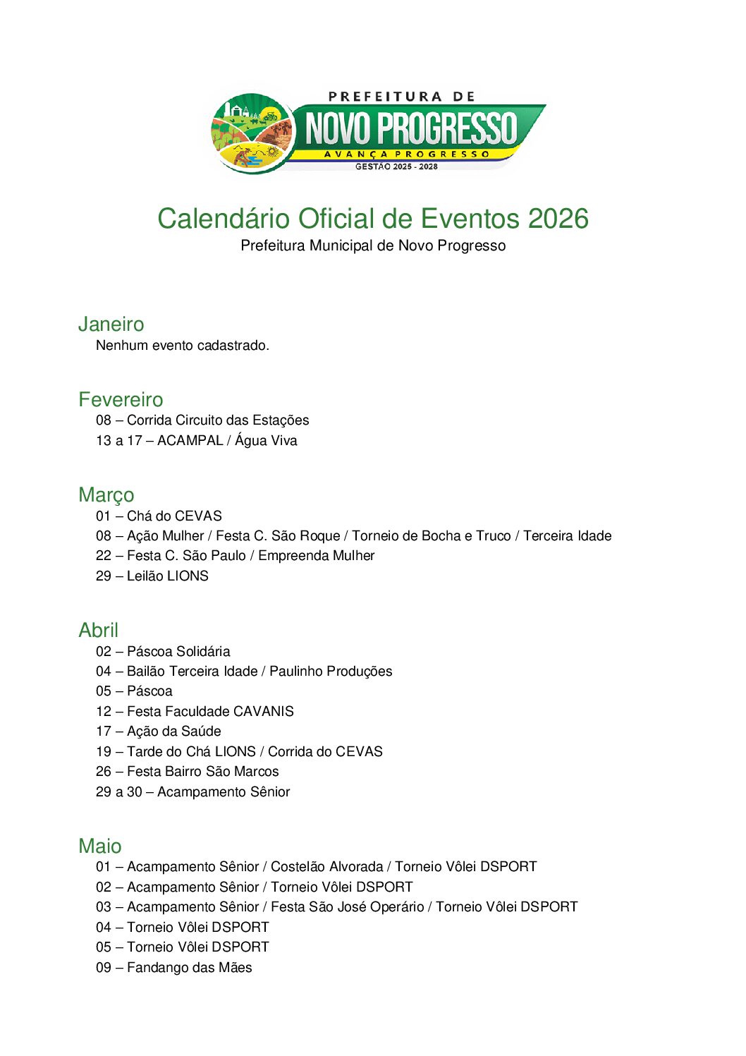 Calendário de eventos 2026 Prefeitura Municipal de Novo Progresso