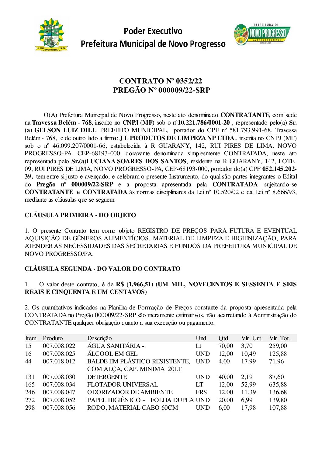 CONTRATO Nº 352.2022 J L PRODUTOS DE LIMPEZA NP LTDA- IND E COMERCIO